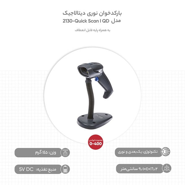 دستگاه بارکدخوان نوری «Quick Scan I QD-2130» ساخت شرکت «DATALOGIC» از سری بارکدخوان‌های مجهز به تکنولوژی نوری و تک‌بعدی این شرکت است که 270 اسکن را در هر ثانیه انجام می‌دهد. محدوده عملکرد بارکدخوان از 0 تا 400 است و برای انجام عمل اسکن فاصله‌ی اسکن، نباید فاصله از 45 سانتی‌متر بیشتر شود. خواندن بارکد به صورت اتوماتیک – سیکلی – تک کلیدی انجام می‌شود. این مدل دارای یک پایه بارکدخوان با انعطاف بالا نیز است و از کنتراست 15 درصد بهره برده است. منبع تغذیه آن برق 5 ولت و پورت‌های ارتباطی آن از نوع کیبوردی یا USB یا سریالی تعبیه شده‌اند. این بارکدخوان ابعادی به اندازه 162.5 × 40.5 × 91.5 میلی‌متر و 145 گرم وزن دارد و وزن سبک آن باعث می‌شود در استفاده‌های طولانی مدت باعث خستگی دست نشود. بارکدخوان دیتالاجیک مدل Quick Scan I QD-2130 در برابر ضربه مقاوم و از درجه حافظت IP42 برخوردار است.