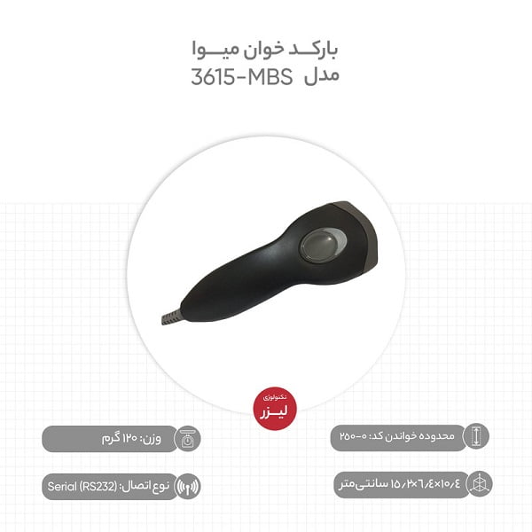 دستگاههای بارکد خوان یکی از موارد پراستفاده در محیطهای مختلف تجاری مانند فروشگاهها و انبارها هستند و ثبت و نگهداری و کنترل اجناس و اموال را بسیار تسهیل میکنند. بارکد خوانها به دلیل ماهیت خود نیازمند سرعت بالایی هستند. محصولی که در این قسمت مشاهده میفرمایید ساخت شرکت میوا بوده و با مدل MBS-3615 روانهی بازار شده است. این دستگاه که بهصورت باسیم طراحی شده است دارای کابلی به طول 2 متر است و در برابر سقوط و ضربه تا ارتفاع 1.5 متری مقاوم است. با استفاده از بارکد خوان خواندن سریال دستگاه بهسرعت انجام میشود. این وسیله بهویژه در محیطهای فروشگاهی که باید در آن در مدتزمانی کم و با سرعتی بالا اجناس بسیاری توسط اپراتور در سیستم ثبت شوند کاربرد بسیار بالایی دارد. سرعت اسکن در این دستگاه برابر 330 اسکن در ثانیه است و اسکن در این مدل تا زاویهی 42 درجه انجام میشود. این بارکد خوان از سیستم اپتیکال Linear CCD با منبع نوری LED قرمز 617 نانومتری برای اسکن بارکد استفاده میکند.