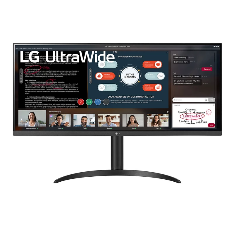 نمایشگر 34WP550-B، دارای وضوح 2560 در 1080 پیکسلی است و نسبت تصویر 21:9 را فراهم می کند. همچنین صفحه نمایش این نمایشگر دارای ابعاد34 اینچی است و به همین دلیل به خوبی می توان از آن به عنوان جایگزینی برای دو مانیتور جداگانه استفاده کرد. نرخ بروزرسانی 75 هرتزی در کنار پشتیبانی از فناوری FreeSync سبب شده است که این نمایشگر برای اجرای بازی ها نیز مناسب باشد. از میان دیگر قابلیت های این نمایشگر می توان به پنل IPS با زاویه دید 178 درجه ای، پشتیبانی از 95 درصد از طیف رنگ های sRGB، حداکثر روشنایی 250 شمع بر متر مربع، نسبت کنتراست 1000:1 و زمان پاسخگویی 5 میلی ثانیه ای اشاره کرد. این محصول ال جی دارای قابلیت حذف نورهای مضر آبی (Blue Light Reduction) و Flicker safe نیز هست و می تواند در استفاده های طولانی مدت به خوبی از چشمان کاربران خود محافظت کند. پایه نگهدارنده این نمایشگر نیز به صورت ارگونومیک طراحی شده است و علاوه بر بهبود زیبایی، امکان تنظیم ارتفاع و چرخش آن را هم فراهم می کند. پورت های ورودی و خروجی این نمایشگر نیز شامل دو درگاه HDMI و همچنین یک خروجی جک 3.5 میلی متری می شود.